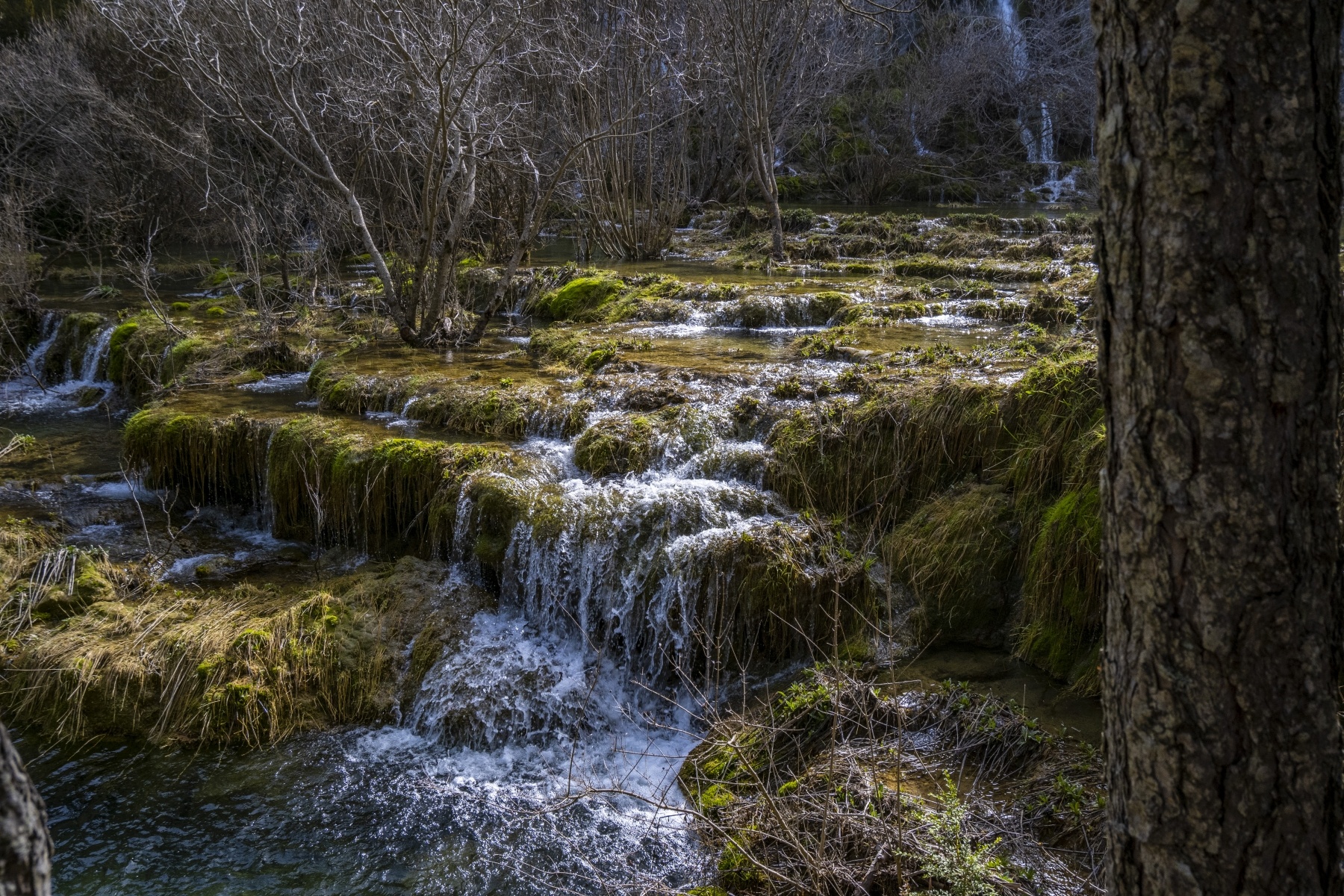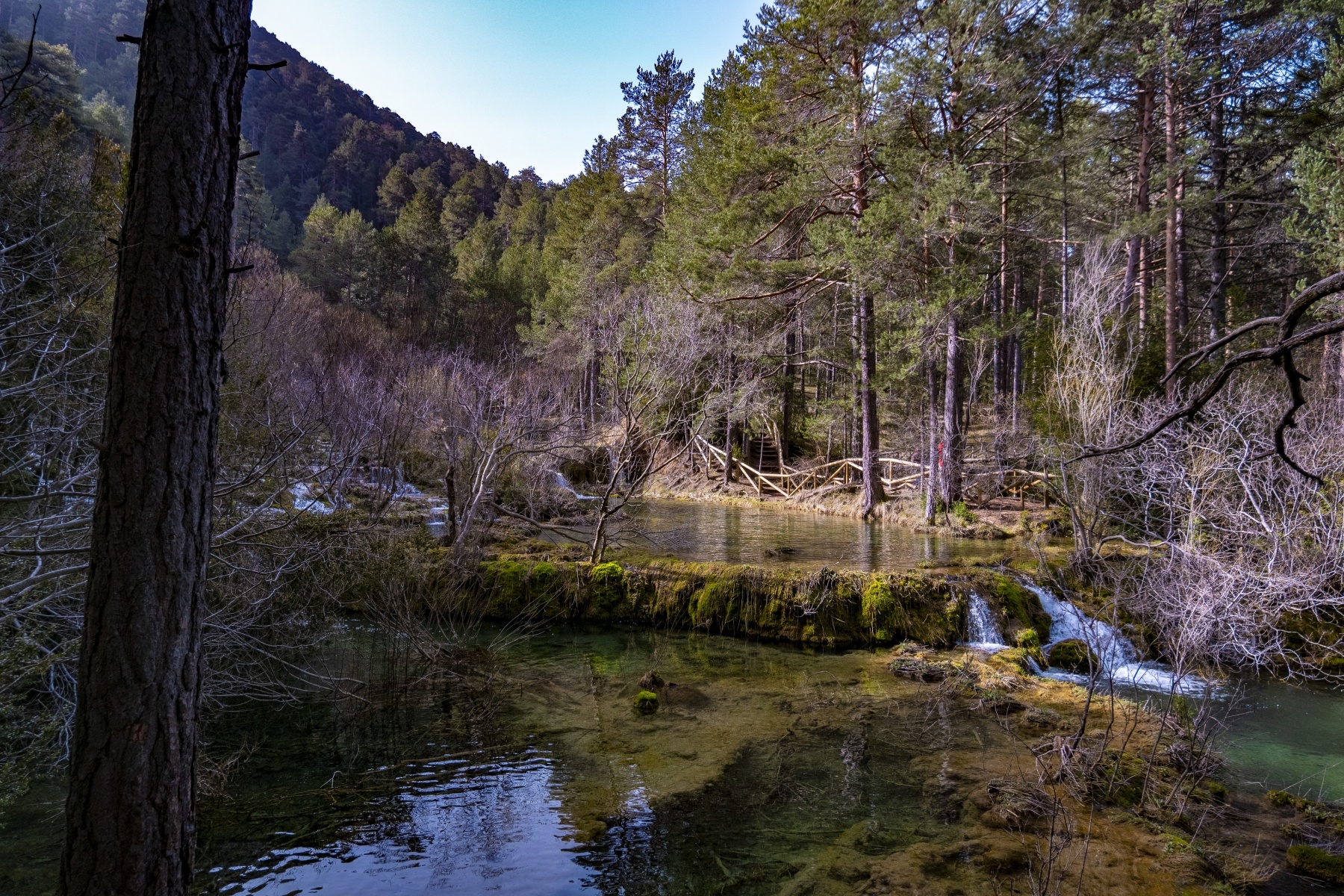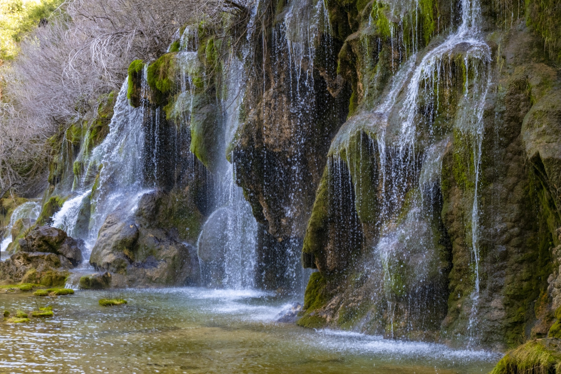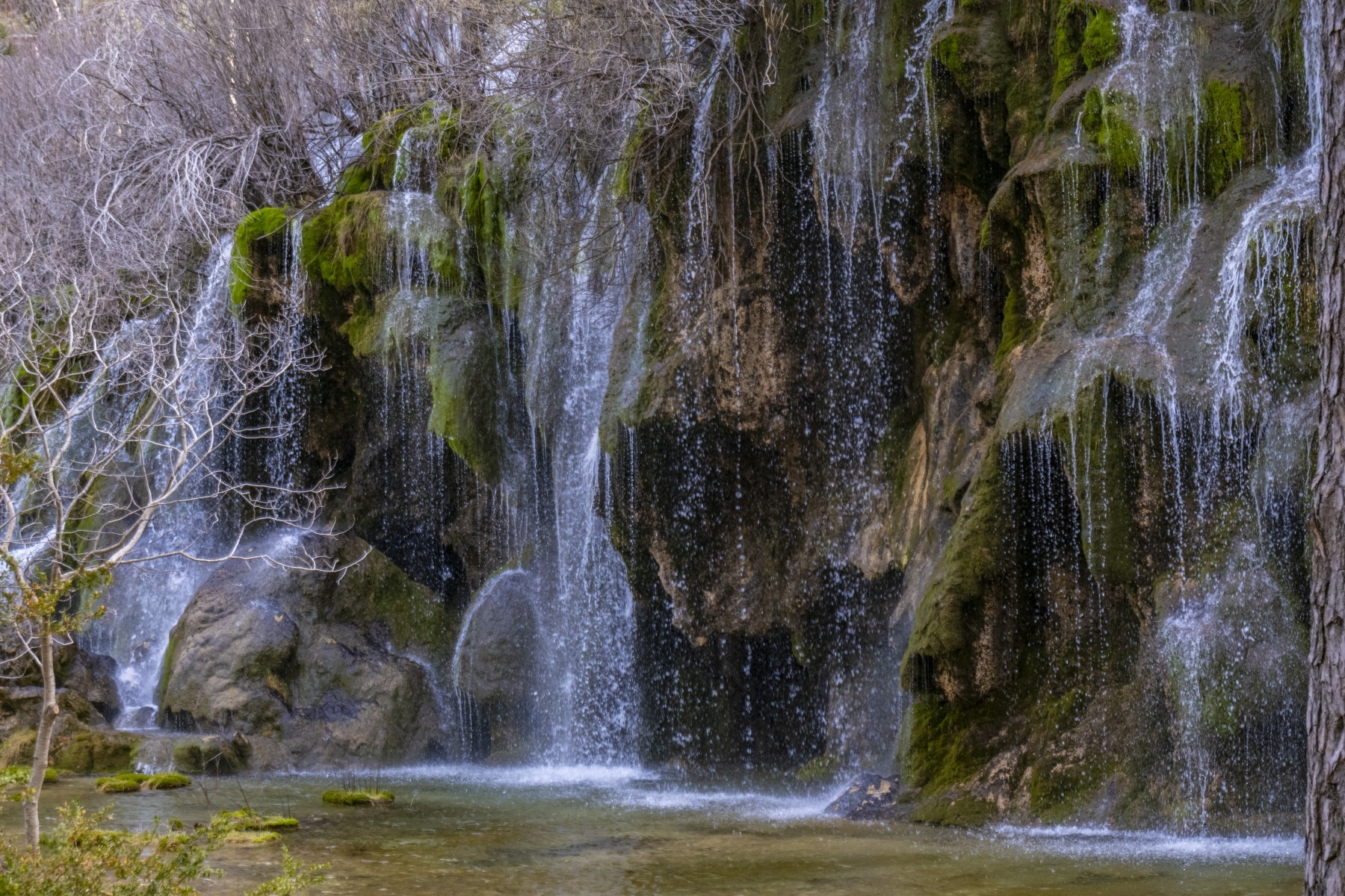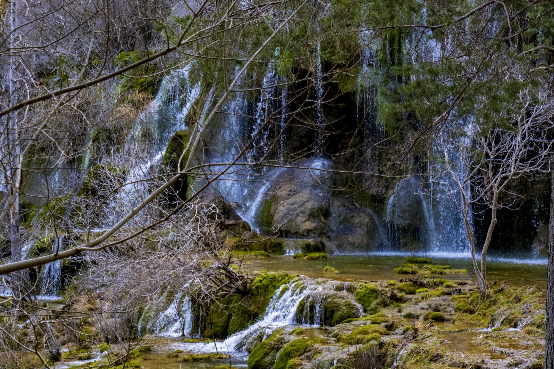 El Nacimiento del Río Cuervo es uno de los parajes más conocidos y fografiados de Cuenca. Rodeada de pinos silvestres, sabinas, acebos, tilos, arces y orquídeas destaca una magestuosa cascada sobre rocas calcáreas que presenta distintas formas y colores en función de la época del año.